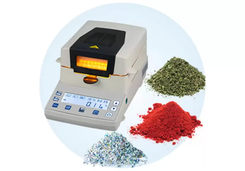 The moisture analyzer is an analytical balance for determining the moisture content of materials. It starts by taking an adequate amount of your material and pouring it into the graduated bowl.