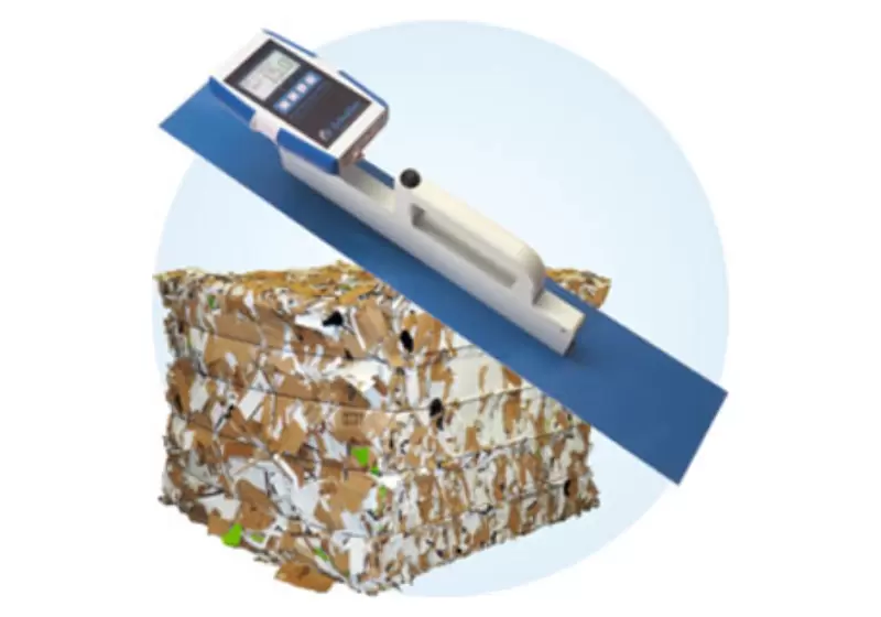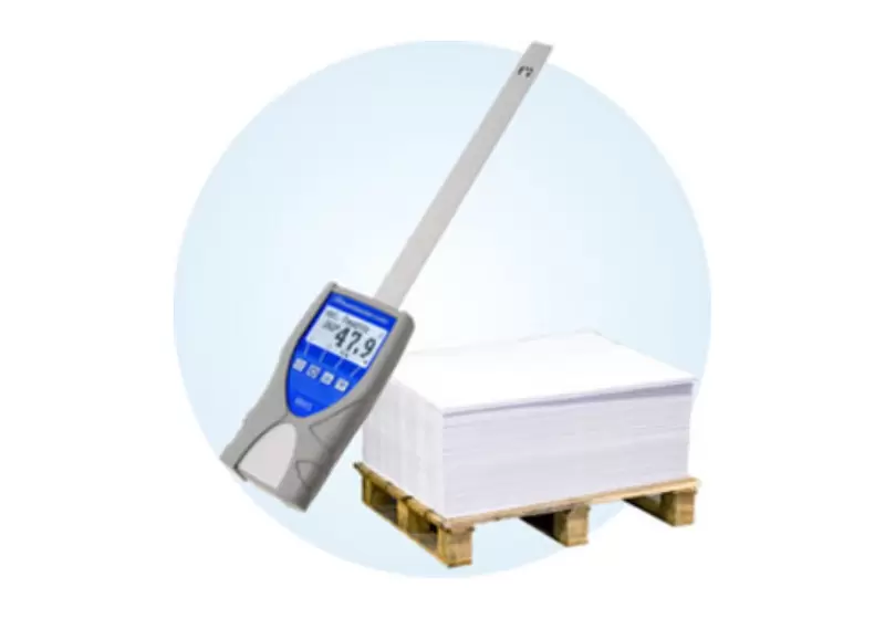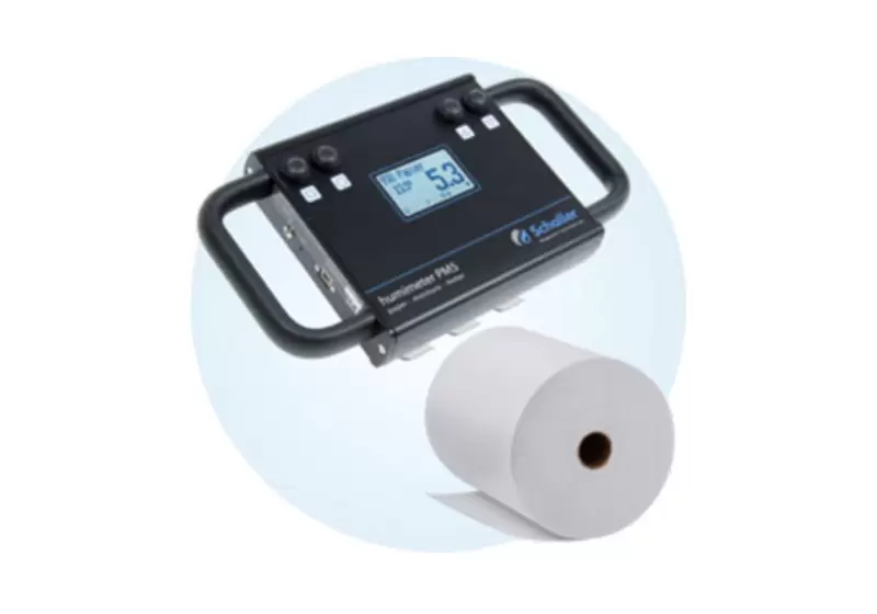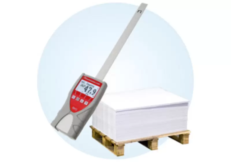 Moisture meter for determining moisture in waste paper/recycled paper and for detecting moisture spots in recycled paper bales. Measurement of compressed bales, rolls, and pulp possible. Measuring range from 1 to 50% water content, measuring depth 500 mm. Additionally, external sensors can be connected to the humimeter RP6.