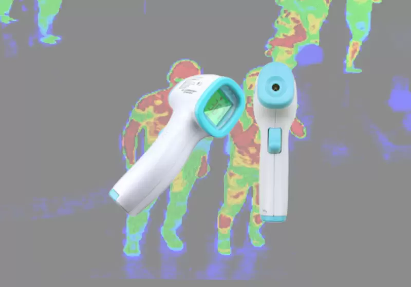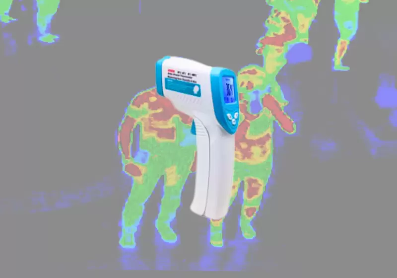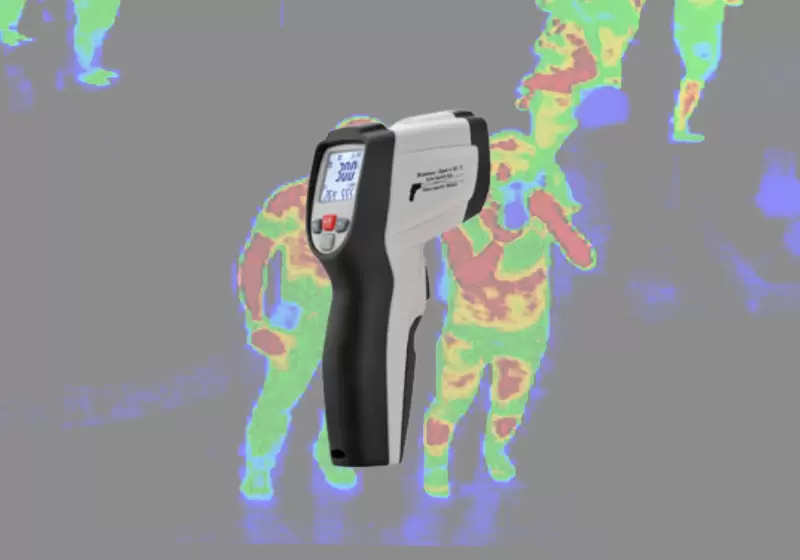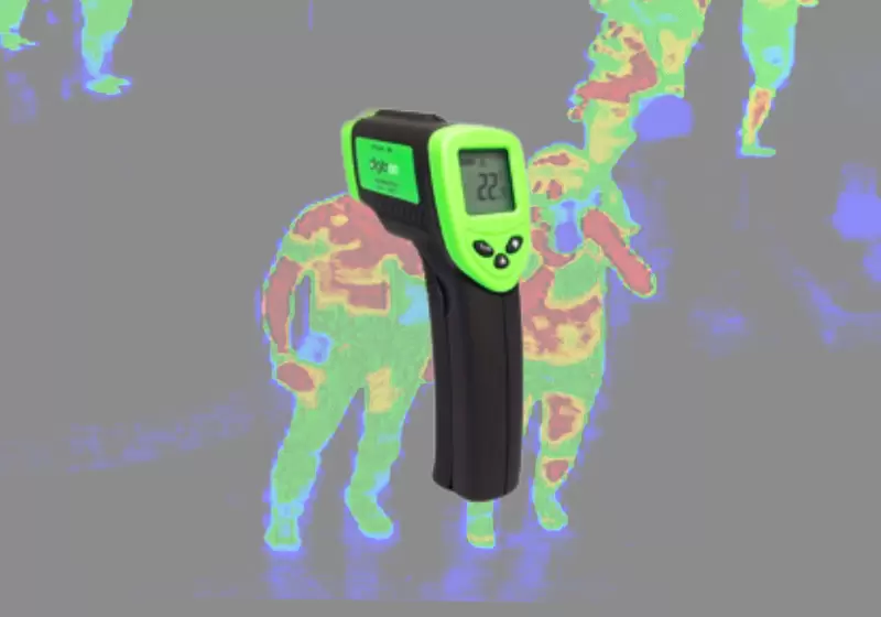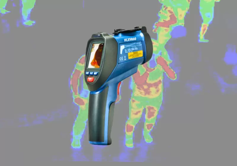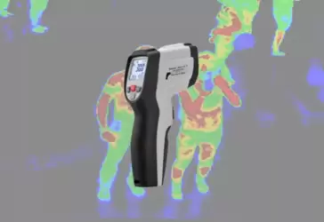 Thermometer with fast response time 0.15 sec. and integrated circular laser pointers focus target (calibrated distance) Triple LCD display indicates infrared temperature, dew point temperature and humidity readings. Double molded case design